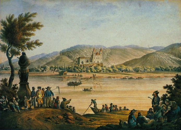 XIX. századi festmény az egykori Máriaradnai templomról , kolostorról és a Maros völgyéről
