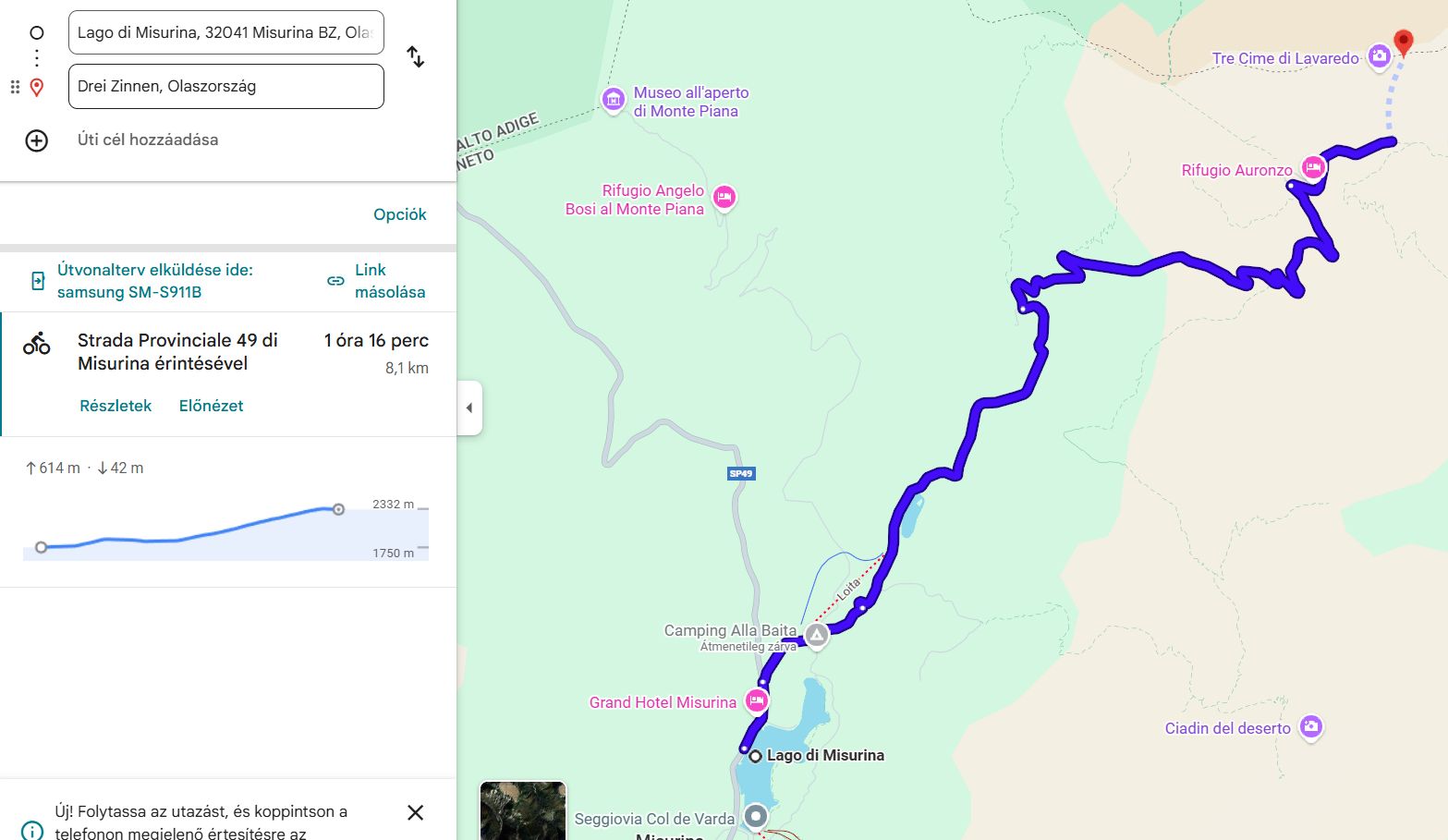 Délután folyamatos érkezés a Misurina-tavi kempingbe. Az aktívabbaknak már erre a napra is tartogatunk alternatív tekerős programot, mely hegymászással vegyes túrát ígér. Lehetőség van egy csodálatos, de igen nehéz túrára az Auronzo menedékházhoz, mely a Dolomitok Drei Zinnen (olaszul: Tre Cime di Lavaredo), magyarul kb. „Hármas-hegyorom” jellegzetes formájú, három markáns hegycsúcsból álló hegytömb mellett vezet el. A túra összesen 16 km, de a szint 614 métert emelkedik 8 km alatt, majd visszafele ugyanennyit kell fékezni.