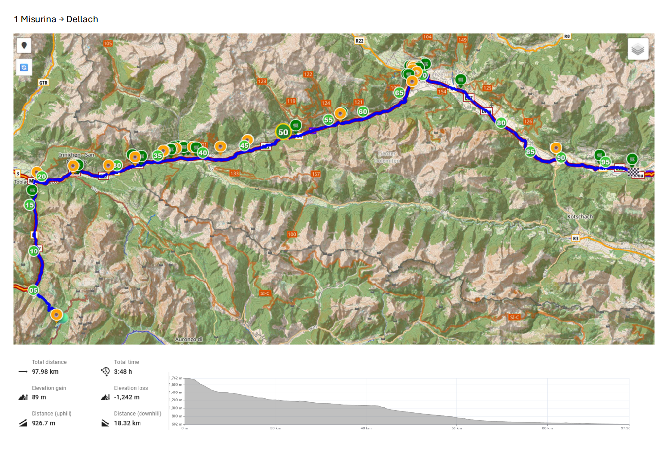 A reggeli elfogyasztása és a csomagok, sátrak összepakolása és a kerékpárok beállítása és ellenőrzése után elindulunk Toblach irányába, ahol rövid pihenőt, kávészünetet tartunk. Útközben megcsodálhatjuk az Alpok lélegzetelállító csúcsait., Toblach után 7 km-el kis kitérőt teszünk a Dráva forrásához, San Candido településnél, rátérünk a Dráva-kerékpáútra majd folytatjuk ereszkedésünket (a mai napon több mint 1200 méter szintet gurulunk) További 12 km múlva elérjük Ausztriát. A Dráva csodálatos völgyében gurulunk, amit az itt élők évszázadok óta közlekedési folyósóként használnak. Lienznél (66 km) hosszabb szünetet tartunk mai tekerésünkben. A kisváros Kelet-Tirol székhelye. Érdemes betekerni a belvárosba, ahol színes házaival és kedves kis főterével, valamint klasszikus osztrák cukrászdájával várja a turistákat. Az utolsó 30 km gurulás már csak levezetése lesz a mai napnak. A dellachi kempingbe érve felépítjük sátrainkat és a pihenésé lesz a főszerep.