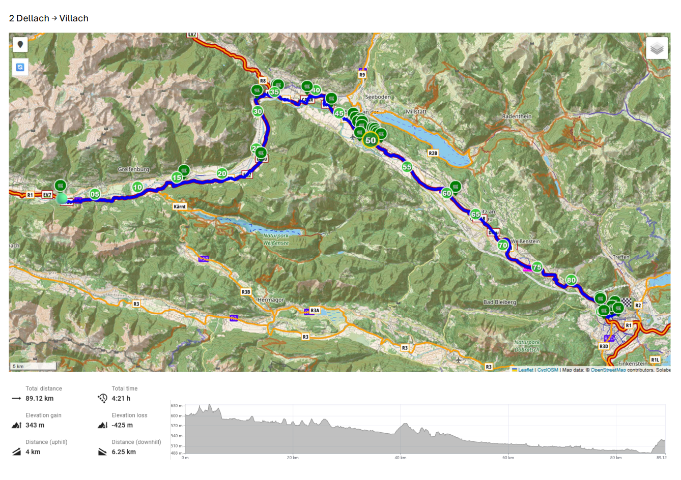 Időben szedjük a sátorfánkat, mert a napi távunk ismét kilencessel kezdődik, és a tegnapinál változatosabb terepen fogunk haladni. 36 kilométer megtétele után érünk el Lendorf községbe, ahol jobbra fordulva áthaladunk a Dráva hídján Rosenheim irányába. Kb félúton érkezünk Spittal an der Drau városába, ahol érdemed kis pihenőt tartani, ahol érdemes megnézni a Rothenturn-kastélyt, valamint a főteret. Visszatérve a Dráva-menti kerékpárútra folyamatosan délkeleti irányba haladunk a Dráva széles és igen látványos völgyében. A kempingbe érkezés előtt Villach városán haladunk keresztül, ahol érdemes feltankolni készleteinket mert Ausztriában vasárnap zárva vannak a boltok. A város agglomerációjában található esti szálláshelyünk, ahol eltölthetjük jól megérdemelt pihenőnket.