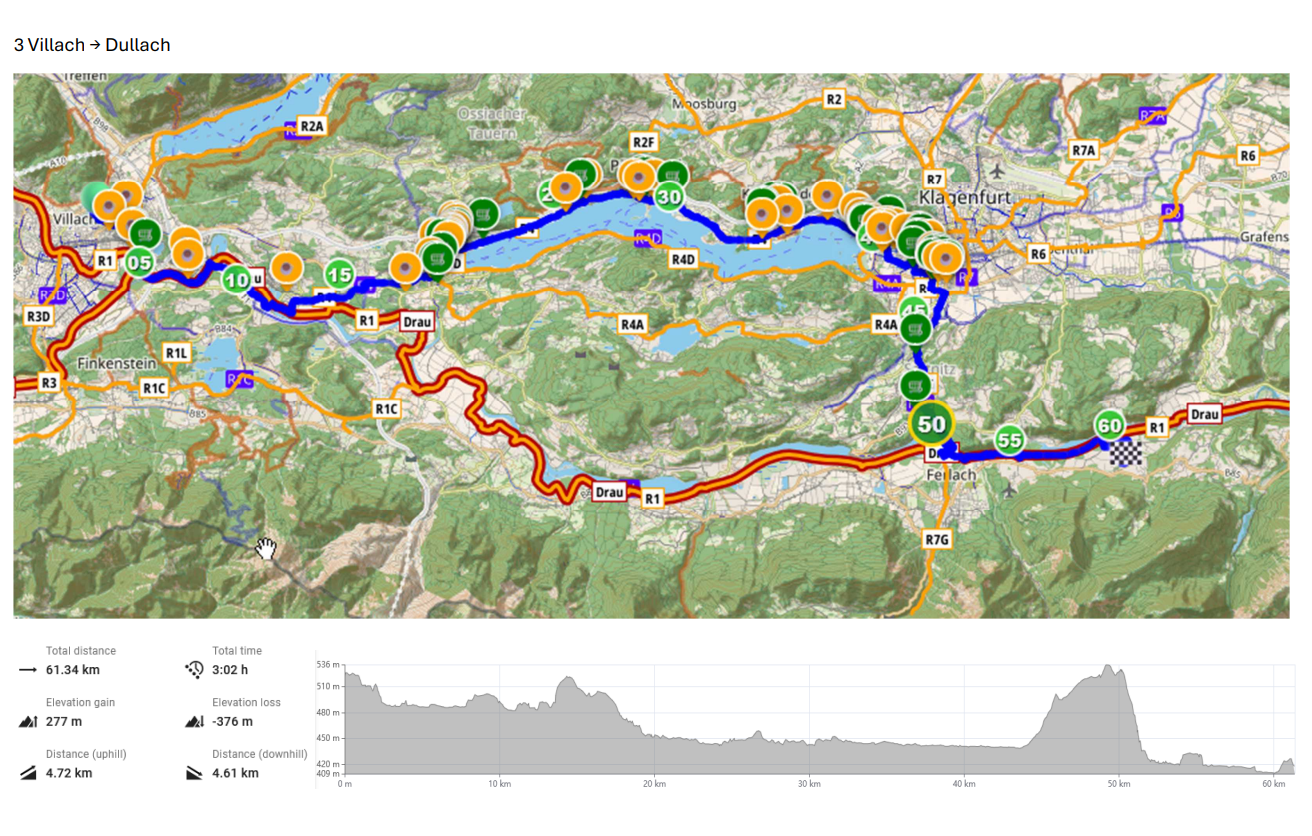 Erre a napra tervezett táv szinte gyerekjátéknak tűnik az előző napihoz képest. Ráérősen indulunk és mire belerázódunk a tempóba, 24 km megtétele után már el is érkezünk mai napunk gyöngyszeméhez, a Wörthi-tóhoz. Több úton is el lehet jutni mai célállomásunkhoz, de a legkisebb szint és a leglátványosabb útvonal a tó déli oldalán vezet. A Wörthi-tó keleti csücskében elérjük Klagenfurt városát, ahol mai hosszabb pihenőnket, ebédszünetünket töltjük. Innen az utolsó 20 kilométer lesz a nap kihívása, hiszen 130 méteres szintemelkedést kell leküzdenünk, hogy utána erős fékezéssel beguruljunk esti kempingünkbe.
