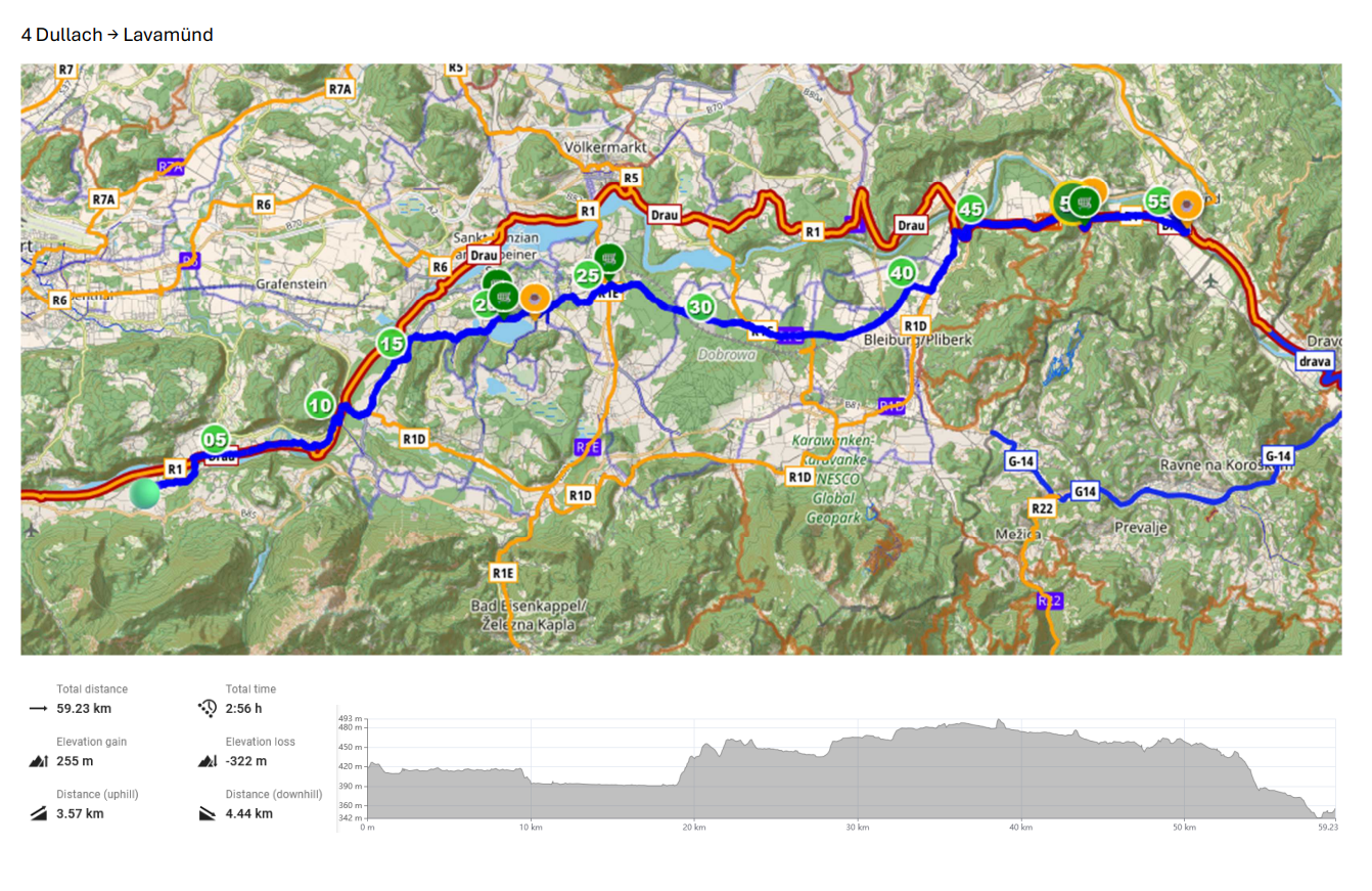 Ezen a reggelen is ráérős indulást tervezünk, hiszen mára a legrövidebb táv vár ránk öt napos tekerésünk során. Az első nagyobb emelkedő kb. 20 km-nél vár ránk. A mai nap kellemes terepen, dimbes-dombos környezetben, kis falvak érintésével jutunk el Lawamündbe, mai végállomásunkra.