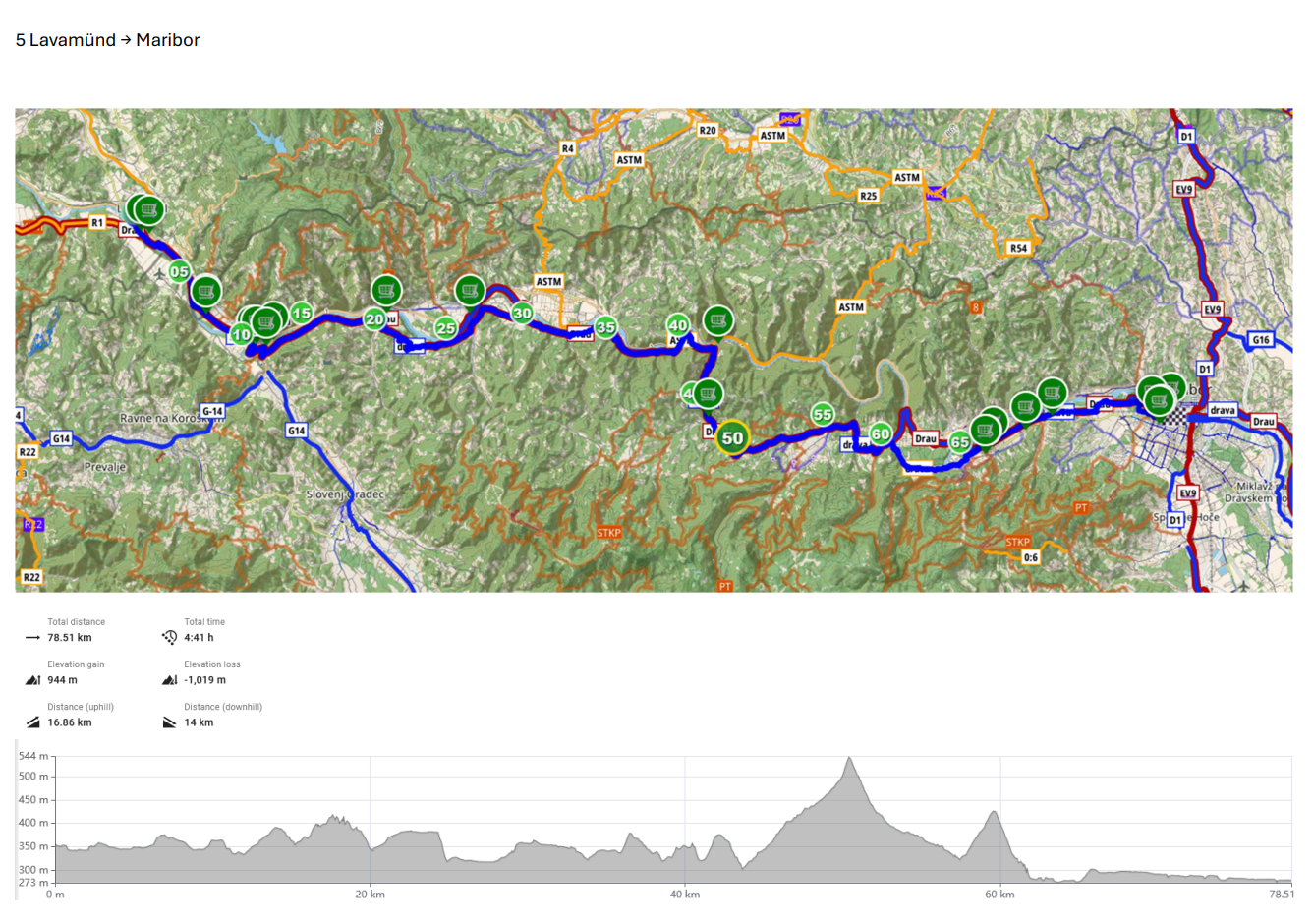 A várost elhagyva áttekerünk Szlovénia területére. Időben szeretnénk a mai napon indulni, mert a mai távunk ismét 80 km körüli, ami a terepet illeti, hullámvasút jellegű kihívás vár ránk. Az emelkedőknél csak a lejtők lesznek nagyobbak. Kb 5 órás tekerés után érkezünk meg autóinkhoz, túránk végállomására, Mariborba.